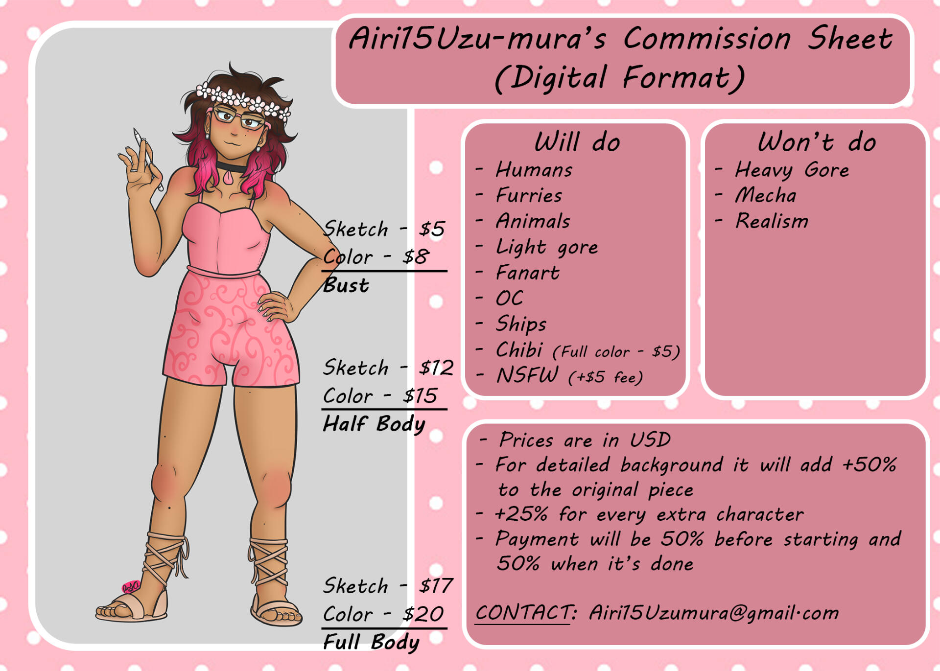 Commissions are for NON-COMMERCIAL use only! If the commission is for commercial use, an extra fee will be added to the price.